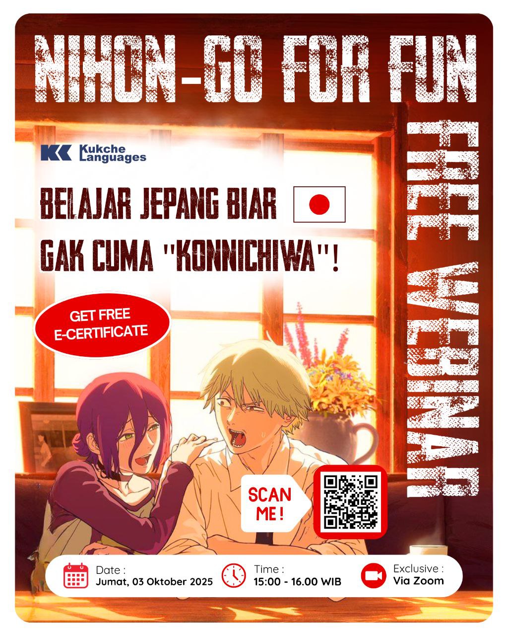 Kamu WIBU? Suka nonton anime? Mau belajar Bahasa Jepang dari anime & lagu lagu Jepang? Yuk langsung aja daftar webinar gratis Bahasa Jepang bareng Kukche Languages — dijamin seru dan bermanfaat! 🤩✨