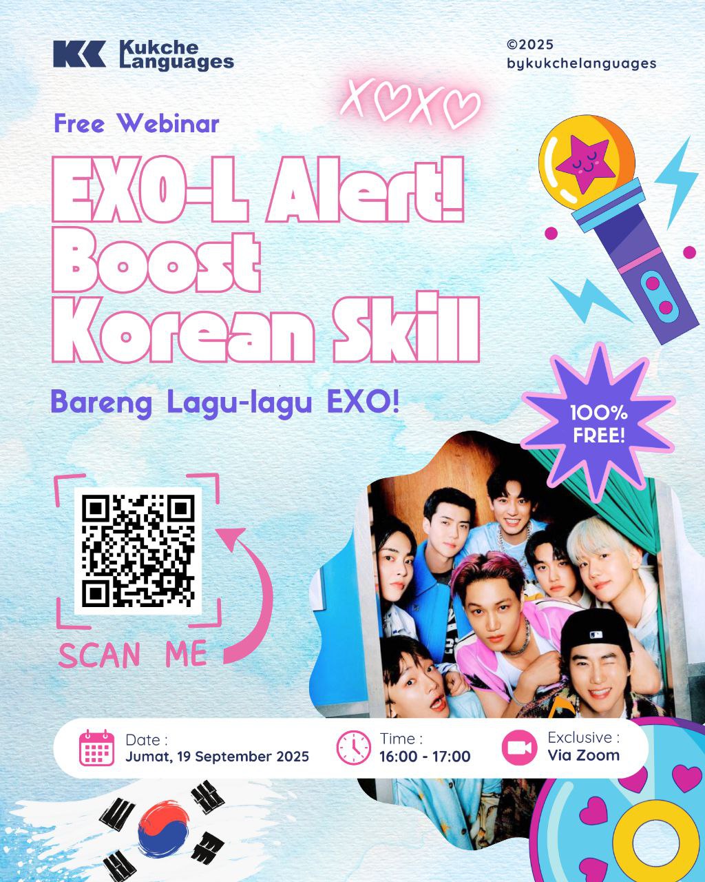 Yuk ikutan webinar gratis bareng Kukche Languages! Kita bakal belajar Bahasa Korea dengan cara seru — langsung dari lagu-lagu EXO favorit kamu! Dijamin fun, bermanfaat, dan pastinya cocok buat kamu yang doyan K-Pop!