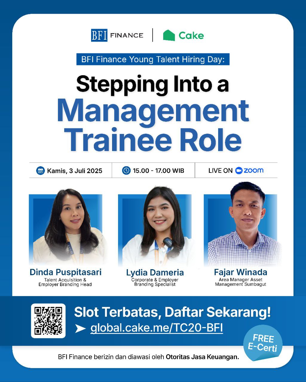 BFI Finance membuka peluang untuk berkarir di jalur fast track lewat Management Trainee Program! Cari tahu lebih dalam tentang programnya langsung bareng tim BFI Finance melalui: