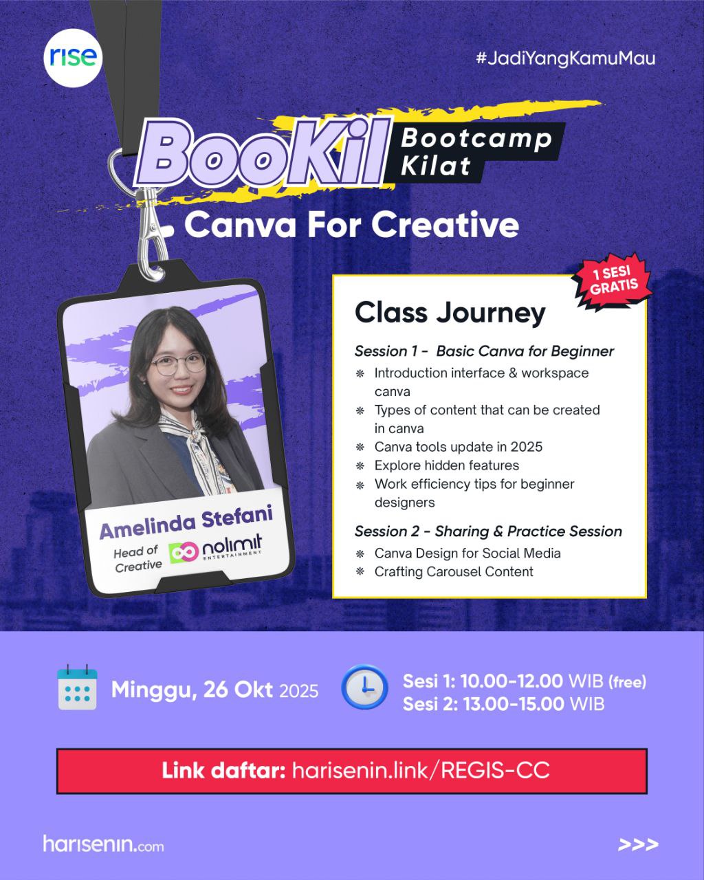 Tenang! Di BooKil (Bootcamp Kilat) kali ini kamu bakal belajar langsung bareng Amelinda Stefani — Head of Creative Nolmit Entertainment! 💡