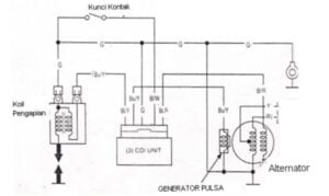 - Kelompok kontak point/pemutus arus yaitu Unit Capacitor Discharge Ignition (CDI) dan komponen didalamnya.