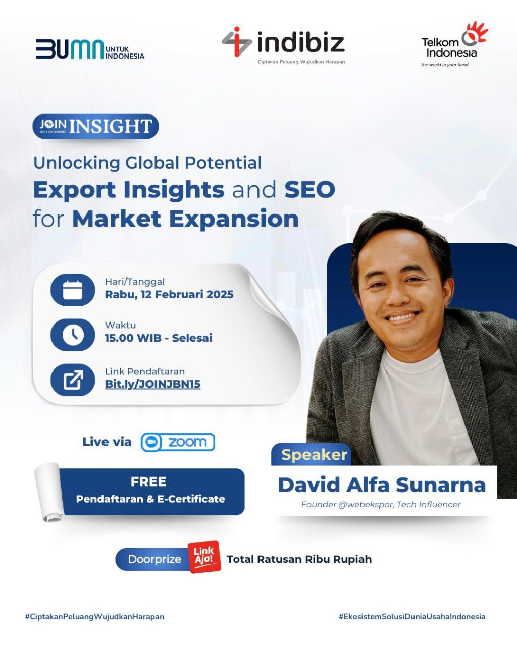 Kami menghadirkan @davidalfasunarna, seorang Tech Influencer dan pendiri @webekspor, yang akan berbagi wawasan berharga secara lengkap tentang cara mengoptimalkan website untuk perkembangan bisnis. 🌐✨.