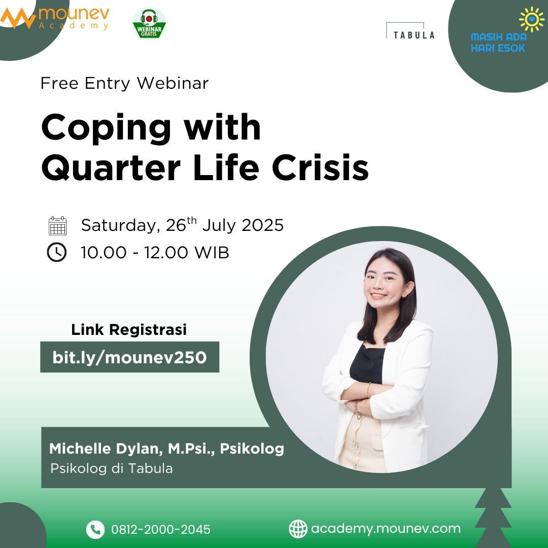 Quarter Life Crisis adalah masa ketika seseorang mulai mempertanyakan arah hidupnya, merasa cemas akan masa depan, dan mungkin merasa terjebak antara harapan dan kenyataan. Silahkan mendaftarkan diri pada webinar dibawah ini untuk penjelasan selengkapnya.