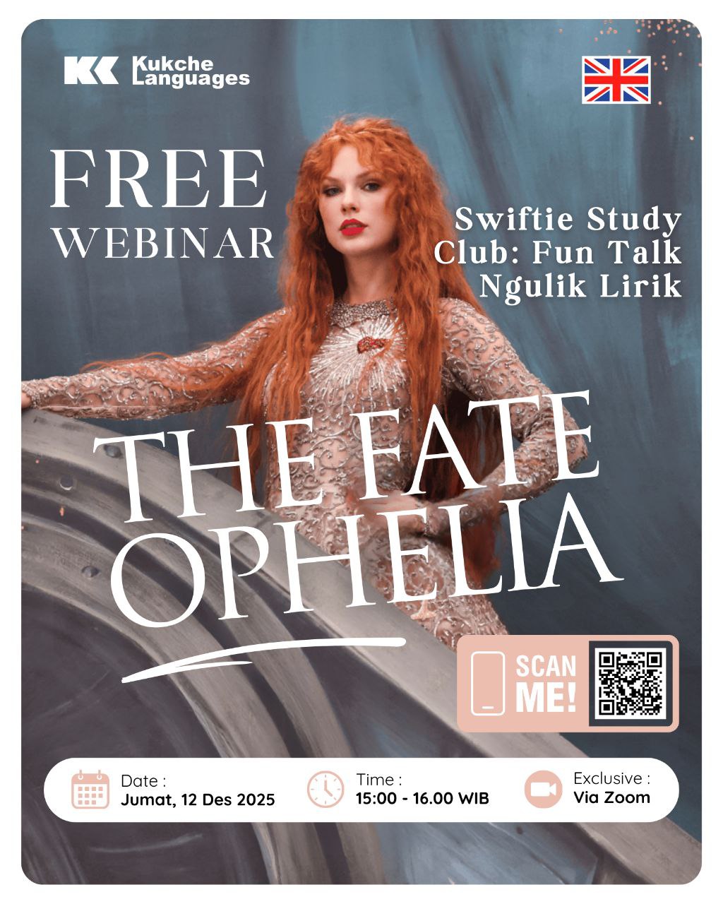 Kamu lagi keracunan lagu “The Fate of Ophelia”? Suka dengerin tapi masih bingung arti lirik atau vibes ceritanya? Tenanggg~ kamu bisa belajar, ngobrol, dan seru-seruan bareng di WEBINAR ini! 💖