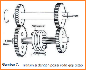 Pada model transmisi roda gigi tetap ini memungkinkan dipergunakan bentuk roda gigi selain model spur. Sehingga memungkinkan penggunaan roda gigi yang lebih kuat. Kopling geser dapat digeser kekanan atau kekiri. Bila kopling ada ditengah maka berarti transmisi pada posisi netral. Pada posisi ini meskipun roda gigi C & D terus berputar bersama roda gigi A & B, namun tidak ada pemindahan putaran keporos output. Hal ini karena baik roda gigi C maupun roda gigi D terpasang bebas terhadap poros output. Posisi gigi 1, kopling geser digeser kekiri hingga berhubungan dengan roda gigi D. Sehingga putaran poros input disalurkan melalui roda gigi A memutar roda gigi D dan membawa kopling geser yang telah terhubung, dan akhirnya poros output terbawa putaran melalui kopling geser. Posisi gigi 2, kopling digeser kekanan hingga berhubungan dengan roda gigi C. Sehingga putaran poros input disalurkan melalui roda gigi B memutar roda gigi C dan membawa kopling geser yang telah terhubung, dan akhirnya poros output terbawa putaran melalui kopling geser.