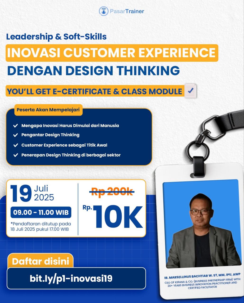 Mau tahu cara meningkatkan customer experience lewat pendekatan yang human-centered? Yuk, ikut kelas ini dan pelajari langsung dari Ir. Marsellinus Bachtiar – praktisi inovasi bisnis dengan pengalaman lebih dari 20 tahun!