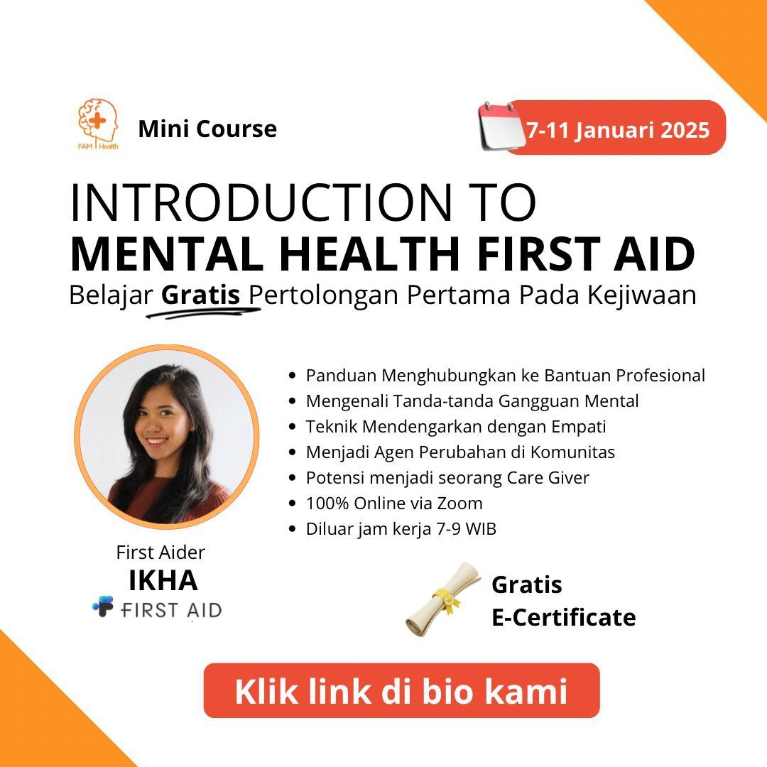 Ingin tahu cara memberikan pertolongan pertama pada masalah kesehatan mental ? Ikuti mini course GRATIS kami setiap hari mulai tanggal 7-11 Januari : ‘Introduction for mental health first aid’. Belajar teknik mendengarkan empati, mengenali tanda-tanda gangguan mental, dan menjadi agen perubahan di komunitas 🌞