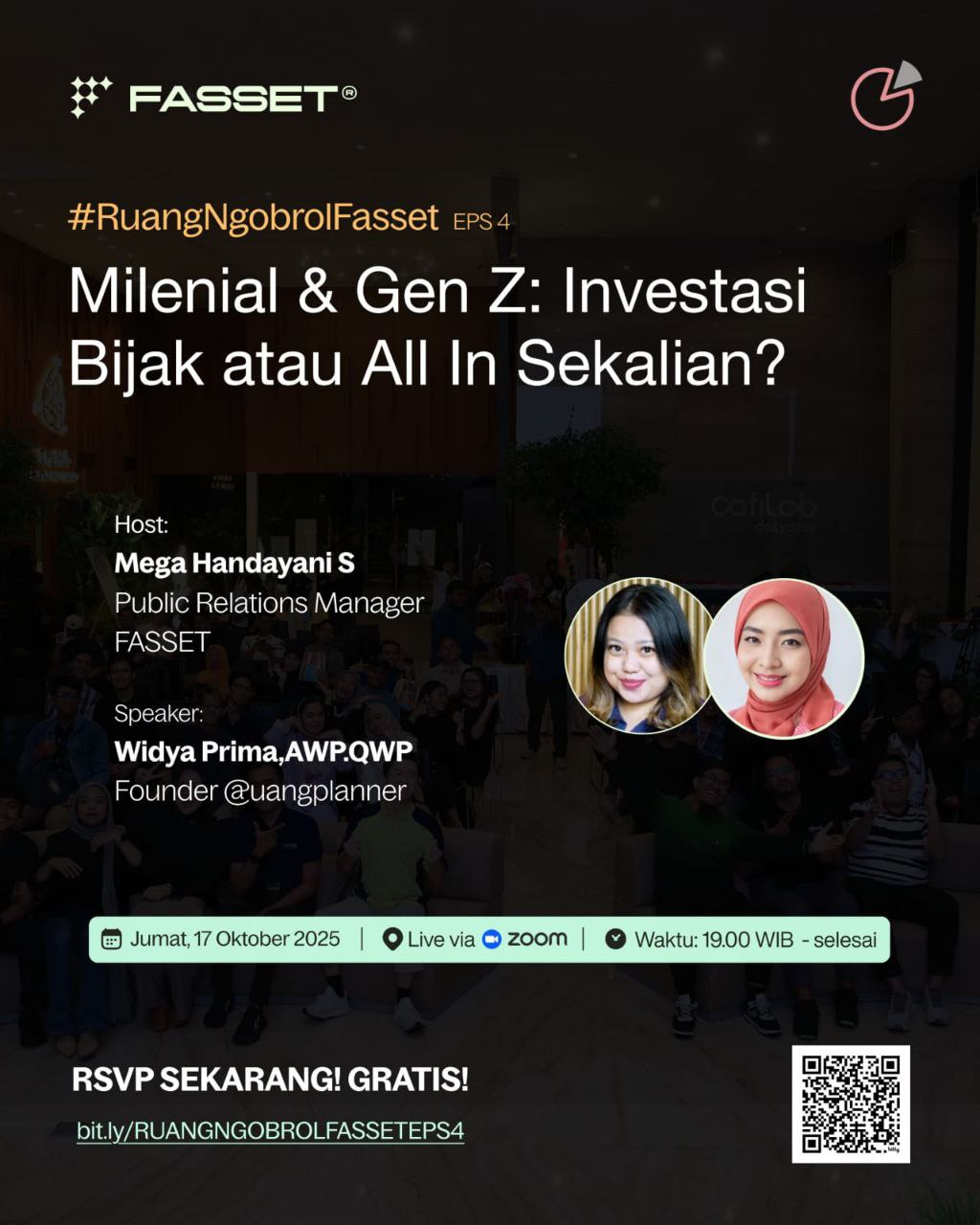 Yuk join webinar #RuangNgobrolFasset Eps 4 βMilenial & Gen Z: Investasi Bijak atau All In Sekalian?β. Webinar ini akan menghadirkan narasumber yaitu Financial Planner kenamaan kak Widya Madrin, Founder @uangplanner yang pastinya sudah berpengalaman di bidangnya. Kita bakal kupas tuntas bagaimana membangun stabilitas finansial, Strategi perencanaan keuangan jangka pendek dan jangka panjang, Cara kelola risiko buat investasi dan juga cara menghindari jebakan finansial yang sering terjadi.