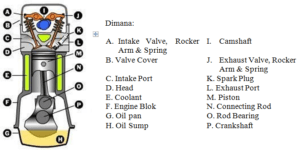 Begitu pula pada mesin diesel 4 langkah. Jadi pada motor 4 langkah, piston bergerak dari BDC ke TDC atau sebaliknya sebanyak 4 kali. Busi atau sparkplug memercikkan bunga api sebanyak sekali setiap piston bergerak sebanyak 4 langkah. Sedangkan pada mesin 2 langkah, sparkplug memercikkan bunga api sekali tiap 2 langkah piston. Mesin 4 langkah memiliki sistem camshaft yang tidak dimiliki mesin 2 langkah. Sistem camshaft terdiri dari intake dan exhaust valve, rocker arm dan spring, dan batang camshaft. Sistem camshaft ini berguna untuk mengatur ketepatan dan sinkronisasi antara intake/exhaust valve dengan pergerakan piston. Jadi saat busi memercikkan bunga api harus tepat saat piston beberapa derajat sebelum TDC dan kedua valve atau katup pada posisi menutup. Gambar 2.3 memperlihatkan bagian- bagian mesin 4 langkah.