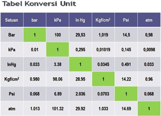 Satuan tekanan yang paling sering digunakan di bidang otomotif adalah bar, KPa, in Hg, Kgf/Cm2, Psi (Lb/in2, Atm. Berikut adalah tabel konversi dari masing-masing satuan.