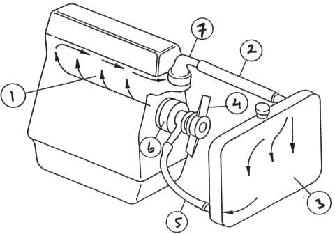 Mesin/motor dihidupkan, maka terjadi proses pembakaran di dalam silinder yang berulang-ulang, temperatur mesin dan air pendingin semakin meningkat. Bersamaan dengan itu, pompa air (6) berputar, maka terjadi sirkulasi air hanya di dalam rongga blok motor dan kepala silinder (1). Air tidak dapat bersirkulasi melewati radiator (3), karena termostat (7) masih tertutup. Oleh karena sirkulasi air hanya di dalam mesin/motor dan air tidak didinginkan radiaitor, maka mesin/motor dan air menjadi cepat panas, cepat mencapai temperatur kerja (80°C s.d 1000 C).