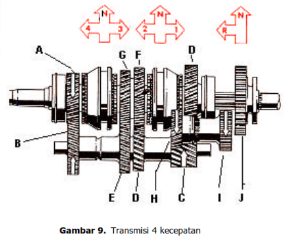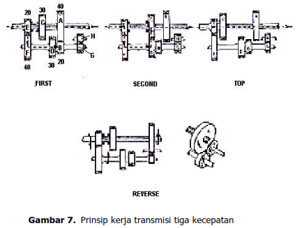 Angka 2 ini menunjukan bahwa momen output pada transmisi akan 2 kali lebih besar dibandingkan momen pada poros inputnya, namun kecepatan/putarannya poros output transmisi ½ dari putraran poros input. Artinya pada rpm mesin yang sama, kecepatan kendaraan lebih cepat dua kali dibandingkan posisi gigi pertama. Posisi Gigi Ketiga atau tertinggi, pada posisi ini roda gigi A tetap bebas, roda gigi C dilepas dari roda gigi D dan digeser dihubungkan langsung melalui dog clutch dengan roda gigi E. dengan demikian putaran poros input sama dengan putaran poros output atau 1 : 1. Posisi Gigi Mundur/Reverse, diperlukan untuk menggerakan kendaraan mundur. Pada posisi ini roda gigi C digeser pada posisi netral dan roda gigi A digeser berhubungan dengan roda gigi H, putaran roda gigi E ke roda gigi F, selanjutnya roda gigi G yang berputar bersama dengan roda gigi F memutar roda gigi H, dan roda gigi H memutar roda gigi A dan diteruskan keporos output transmisi dengan putaran kebalikan dari poros input. Bila jumlah gigi G adalah 10, maka