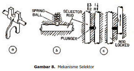 Garpu selektor (selector fork) pada gambar 7a, dipergunakan untuk menggeser roda gigi pada poros utama. Pada transmisi tiga kecepatan ditambah satu kecepatan mundur diperlukan dua buah garpu selektor. Bagian bawah garpu selektor berhubungan dengan roda gigi, sedangkan bagian atasnya berhubungan dengan handel transmisi yang digerakan dari ruang kemudi. Setiap transmisi harus dilengkapi dengan pealatan (a) untuk menempatkan selektor untuk menghindari roda gigi bergerak sendiri, dan (b) untuk mencegah dua gigi terhubung secara bersamaan. Jadi 7b berfungsi untuk menahan posisi roda gigi. Pada posisi ini bila salah satu roda gigi dipindahkan, maka yang lainnya dikunci oleh mekanisme sektor, seperti ter-lihat pada gambar 7c. Penguncian melalui desain plunger yang dipasang antar batang selektor. Dengan demikian bila salah satu roda gigi akan dihubungkan, maka yang lainnya dikunci pada posisi netral. Bila roda gigi A dihubungkan maka roda gigi C dikunci pada posisi netral. Sehingga dengan mekanisme selektor kemungkinan terhubungnya dua roda gigi secara bersamaan dapat dicegah.