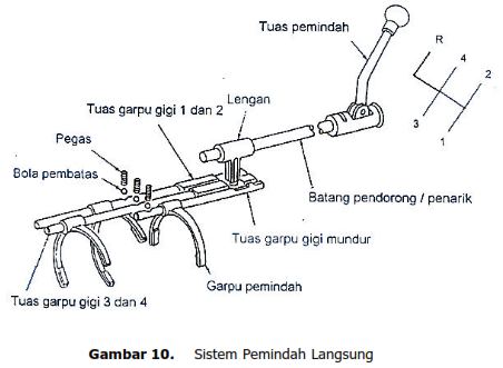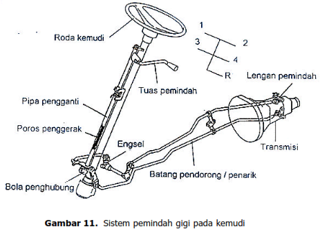 Perhatikan gambar 13, Kalau tuas pemindah didorong penuh ke kiri oleh pengemudi, maka lengan selektor akan berada pada tuas garpu gigi 1 dan 2. pada posisi ini bila pengemudi mendorong kedepan , berarti lengen selector menarik tuas garpu gigi 1 dan 2 dan membawa synchronmesh masuk ke posisi gigi 1. Sebaliknya bila menarik tuas pemindah kebelakang berarti mendorong tuas garpu gigi 1 dan 2 dan membawa synchronmesh masuk ke posisi gigi 2. Kalau tuas pemindah dilepas oleh pengemudi, maka tuas pemindah akan berada ditengah dan lengan selektor akan berada pada tuas garpu gigi 3 dan 4. pada posisi ini bila pengemudi mendorong kedepan , berarti lengen selektor menarik tuas garpu gigi 3 & 4 dan membawa synchronmesh masuk ke posisi gigi 3. Sebaliknya bila menarik tuas pemindah kebelakang berarti mendorong tuas garpu gigi 3 & 4 dan membawa synchronmesh masuk ke posisi gigi 4. Kalau tuas pemindah ditarik penuh ke kanan oleh pengemudi, maka lengan selektor akan berada pada tuas garpu mundur. pada posisi ini bila pengemudi menarik tuas pemindah kebelakang berarti mendorong tuas garpu mundur dan mem-bawa roda gigi masuk ke posisi gigi mundur. Sistem pemindah gigi handel pada kemudi konstruksinya dapat dilihat pada gambar 14 berikut ini.