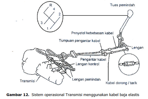 Pada prisipnya pemindahan gigi di dalam transmisi sama dengan yang telah dijelaskan di atas. Sistem ini dipergunakan agar samping pengemudi ruangannya dapat dipergunakan untuk tempat duduk. Contoh pada kendaraan adalah dipergunakan pada mobil Mitsubishi L300. Sementara untuk sistem menggunakan kabel baya elastis, seperti terlihat pada gambar 14 berikut ini dipergunakan pada kendaraan sedan dengan front wheel drive dan mesin melintang. Sistem ini lebih fleksibel dan mampu untuk menjangkau posisi transmisi yang sulit yang tidak memungkinkan digunakan kedua sistem sebelumnya.