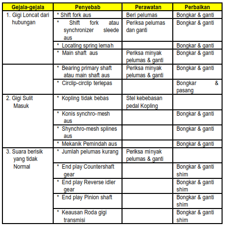 Gejala-gejala berikut ini menandakan bahwa terjadi kesalahan pada unit transmisi manual,