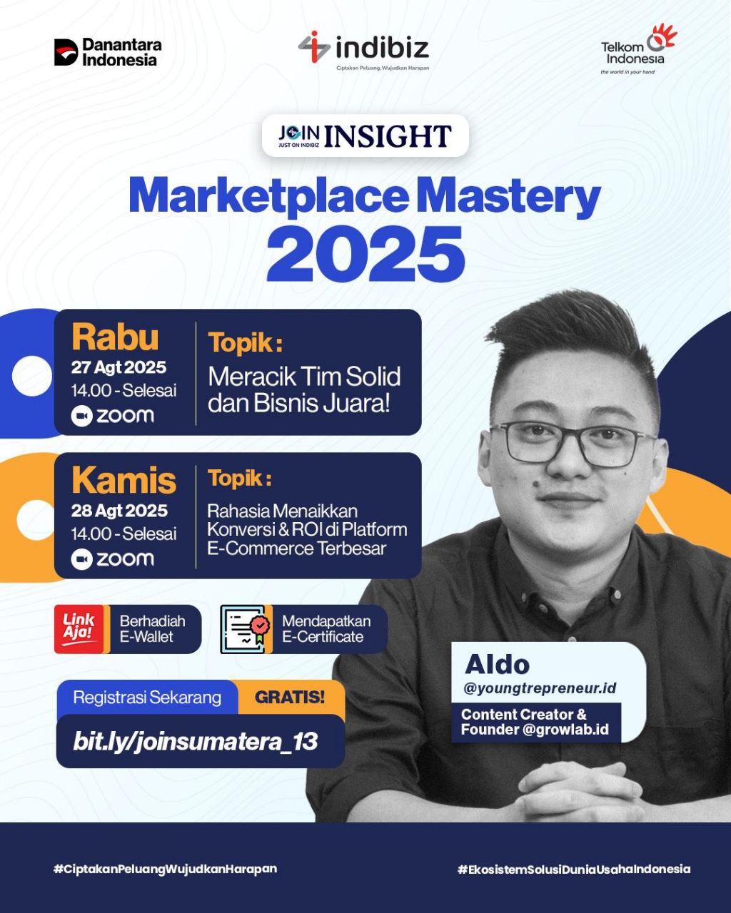 Jangan lewatkan JOIN Insight eksklusif bersama Founder @growlabs.id dan content creator asal Malang, Aldo @youngtrepreneur.id ! Selama dua hari, kita akan membahas secara dalam tentang Strategi Rahasia Menaikkan Konversi & ROI atau Return Of Investment di Platform E-Commerce Terbesar untuk bisnis kecil dan studi kasus langsung bersama Mas Aldo!