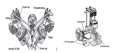 Melalui roda gigi timing gerak putar engkol akan memutar poros nok (cam shaft), karena perbandingan gigi engkol dengan poros nok 1 : 2 maka saat poros engkol berputar 2 kali maka poros nok berputar sekali. Urutan gerak komponen sehingga katup terbuka adalah poros nok – lifter – push rod – roker arm – katup. Urutan gerak menutup adalah katup – roker arm- push rod – lifter – poros nok. Membukanya katup akibat gerak nok menekan, sedangkan gerak menutup akibat gaya pegas saat nok tidak menekan lagi.
