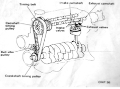 Bila poros engkol berputar menyebabkan exhaust camshaft juga berputar melalui timing belt, sedangkan intake camshaft diputarkan oleh exhaust camshaft melalui roda-roda gigi. Bila sumbu nok (camshaft) berputar, nok akan menekan ke bawah pada valve lifter dan membuka katup. Bila sumbu nok terus berputar, maka katup akan menutup dengan adanya tekanan pegas. Setiap sumbu nok berputar satu kali akan membuka dan menutup katup hisap dan katup buang satu kali pada setiap 2 putaran poros engkol.