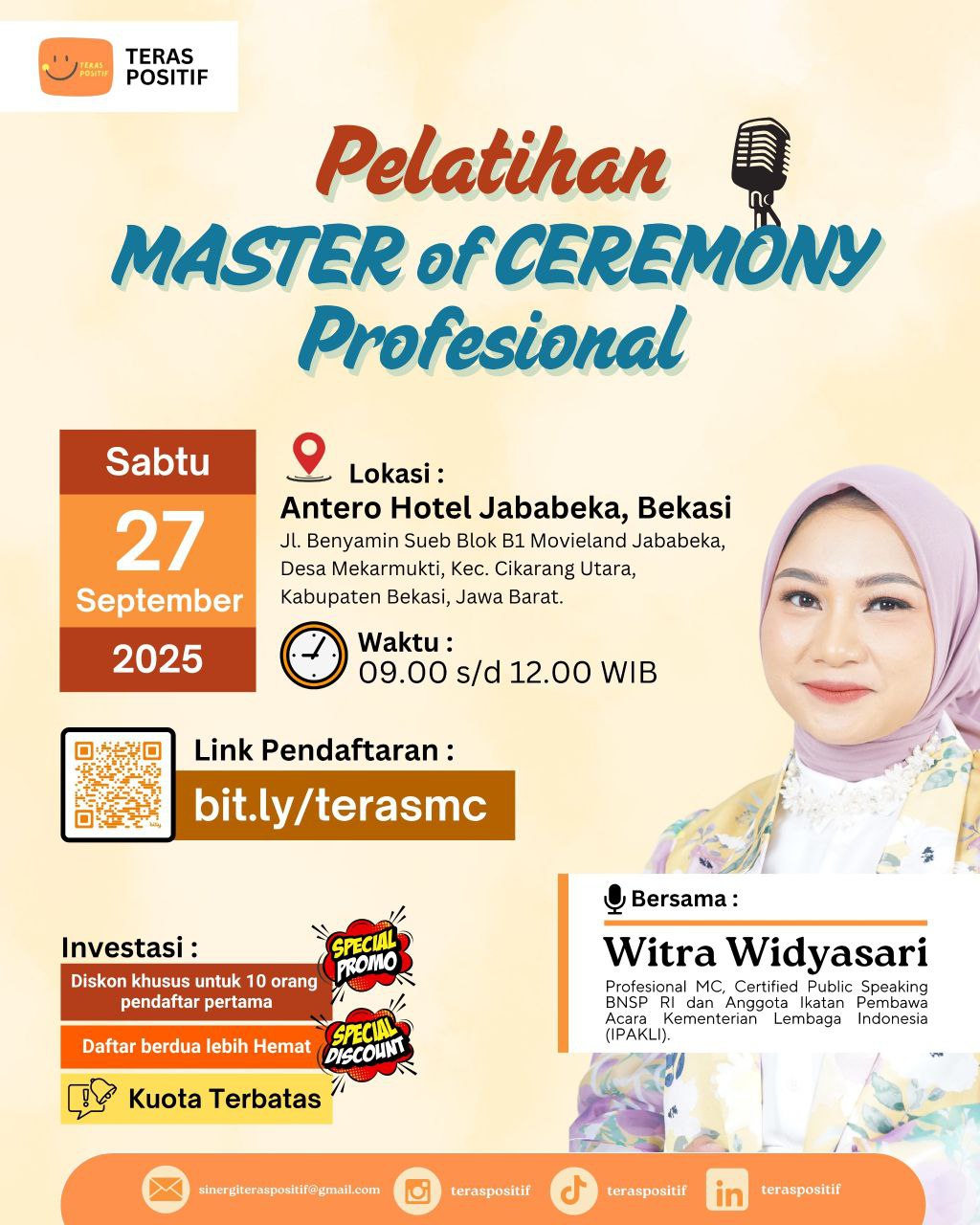 #PelatihanMC #MC #TerasPositif #MCProfesional #WitraWidyasari #PelatihanBekasi #EventBekasi #PublicSpeaking #MCIndonesia #MasterofCeremony #Bekasi