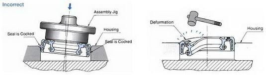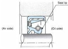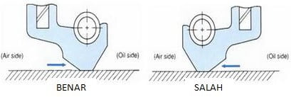 - Pemasangan seal yang normal (benar), yaitu ketika udara berada dibelakang arah tekanan oil. Sedangkan pada gambar selanjutnya ditunjukan bahwa oli mengalir keluar kearah udara karena oil seal dipasang terbalik (salah).