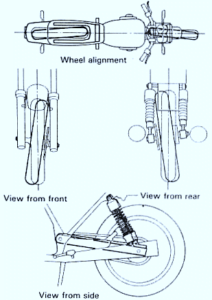c)  Apabila roda depan dan belakang terlihat miring ke satu arah, lakukan permeriksaan pada bagian-bagian swing arm ataupun suspensi depan dari kebengkokan/rangka yang