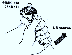 c)  Apabila kemudi terlalu berat atau terlalu ringan, putar mur pengikatnya sampai mencapai ketepatan. Cara pengencangan mur pengikat adalah mengencangkan mur pengikat dengan kuat, kemudian kembalikan putarannya (kendorkan) ke arah kebalikan sebanyak ± 1/8 putaran sampai gerakan kemudi terasa sempurna.