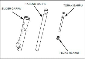 - Lepaskan torak garpu dan pegas reaksi dari tabung garpu, dan tarik keluar tabung garpu dari slider garpu.