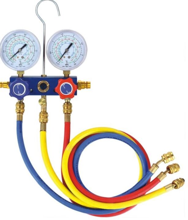 Manifold gauge terdiri dari meter tekan (discharge) dan meter ganda (suction), dua buah keran yang disatukan dan tiga buah selang isi dengan tiga warna yang berlainan. Dengan menghubungkan manifold gauge kepada sistem, dapat lebih cepat mengetahui kesalahan dari sistem. Tekanan kedua meter dari manifold gauge dapat menunjukkan kepada apa yang sedang terjadi di dalam sistem. Selain itu alat tersebut dapat dipakai untuk : menunjukkan vakum, mengisi refrigeran, menambah minyak pelumas, memeriksa tekanan dari sistem dan kondisi kompressor.