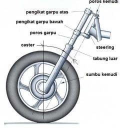 Terkoneksinya garpu suspensi dengan sasis kendaraan melalui steering sangat mempengaruhi kestabilan pengendalian dari system kemudi sepedamotor, oleh karena itu harus diperhitungkan secara tepat besarnya sudut kemiringan menyesuaikan dengan kebutuhan dimana kendaraan tersebut akan digunakan. Kemiringan tersebut dikenal dengan istilah sudut caster (lihat gambar diatas). Dengan sudut caster yang kecil berarti pengendalian sepeda motor terasa baik untuk jalan yang lurus dengan kecepatan tinggi. Tetapi pada kecepatan rendah, pengendalian terasa berat dan kurang enak untuk tikung-menikung.