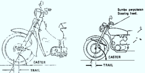 - Trail, Adalah jarak antara titik potong dari garis melalui poros kemudi dengan jalan mendatar, ke titik tumpu ban depan di atas jalan.