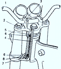 Batang kemudi ditambatkan pada penghubung garpu bagian atas (2) dan diikat oleh pengikat stang (3). Fungsi penghubung garpu (2) adalah sebagai penghubung antara kedua buah garpu depan dan poros kemudi (4) Sistem kemudi dihubungkan terhadap rangka pada bagian kepala rangka.