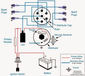- Terminal (-) dihubungkan dengan platina (breaker point) dan kondensor.
