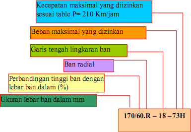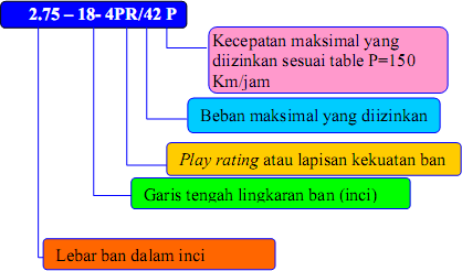 4.60 – H – 18 4PR menyatakan ukuran dari lebar ban, kode kecepatan, diameter pelek, tanda indikasi jumlah lapisan dan kekuatan ban.