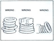 1. Ban yang belum digunakan harus disimpan secara tegak dengan memberikan penahan (spacer) berupa kertas atau karet di bagian beads. Penyimpanan ban tanpa memberikan penahan pada beads akan menyebabkan jarak beads lebih kecil daripada lebar pelek, sehingga pemasangan ban menjadi lebih sulit.