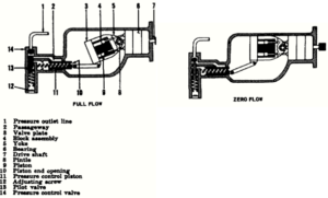 Pada saat tekanan output pompa naik, maka pivot valve terbuka untuk mengalirkan tekanan cairan menuju pressure control piston yang bergerak menekan pegas dan melalui mechanical linkage memutar yoke menuju arah zero flow (zero angle). Kebalikan dari itu bila tekanan terlalu turun maka piston dikembalikan gerakannya oleh piston menuju arah semula sehingga yoke memutar pada posisi kea rah sudut full flow (full flow angle)