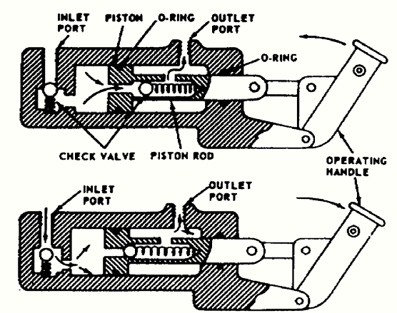 Handle ke kanan : Pada saat handle ke kanan maka piston rod juga ke kanan sehingga inlet check valve terbuka karena kevacuman saat gerakan piston ke kanan. Hal ini akan membawa cairan menuju ke chamber kiri, pada waktu yang sama inner check valve tertutup. Pada saat piston bergerak ke kanan cairan yang ada pada chamber kanan ditekan menuju system.