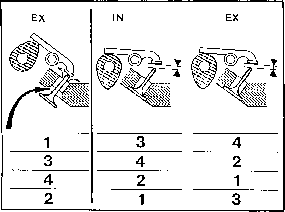 - Stel celah katup menurut tabel dibawah. Kolom 1 menyatakan katup buang (ex) yang sedang terbuka penuh, kolom 2 menyatakan katup masuk (in) yang dapat distel, kolom 3 menyatakan katup buang (ex) yang dapat distel sesuai dengan data. Misalnya jika katup ex silinder 3 sedang terbuka penuh, maka katup yang dapat disetel adalah katup in silinder 4 dan katup ex silinder 2. Berarti pada kendaraan buatan Perancis, poros engkol harus diputar 4 kali (menepatkan kondisi pada kolom 1) untuk menyelesaikan penyetelan semua katup.