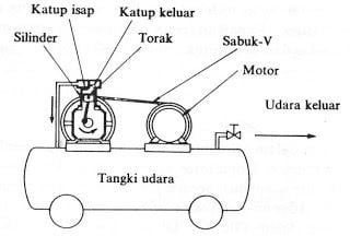 Kompresor yang terlihat pada gambar diatas biasa kita jumpai dibengkel- bengkel kecil sebagai penghasil udara tekan untuk keperluan pembersih kotoran dan pengisi ban sepeda motor atau mobil. Prinsip kerjanya sama dengan pompa ban, yaitu memampatkan udara di dalam silinder dengan torak. Perbedaanya terletak pada katupnya, kedua katup dipasang dikepala silinder, dan tenaga penggeraknya adalah motor listrik. Tangki udara berfungsi sama dengan ban yaitu sebagai penyimpan energi udara tekan.