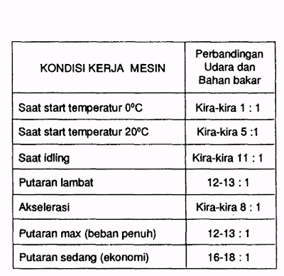 tenaga yang besar pada mesin. Perbandingan udara– bahan bakar dalam teorinya adalah 15 : 1, yaitu 15 untuk udara berbanding 1 untuk bahan bakar. Tetapi pada kenyataannya, mesin menghendaki campuran udara–bahan bakar dalam perbandingan yang berbeda-beda tergantung pada temperatur, kecepatan mesin, beban dan kondisi. Pada tabel di bawah ini diperlihatkan perbandingan udara–bahan bakar yang dibutuhkan sesuai dengan kondisi kendaraan.