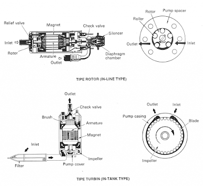 mengalirkan bahan bakar tersebut diperlukan fuel pump. Ada dua tipe fuel pump, yaitu tipe mekanik dan tipe elektrik. Fuel pump tipe mekanik menggunakan diaphragma dan biasanya digunakan pada kendaraan yang menggunakan karburator. Fuel pump tipe elektrik dipakai pada mesin yang menggunakan EFI.