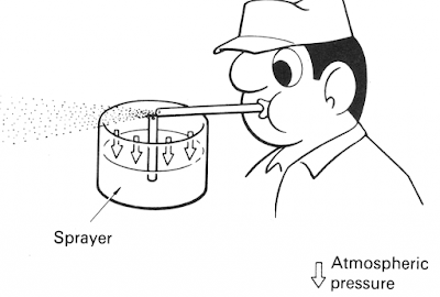 Ketika udara ditiup melalui bagian ujung dari pipa penyemprot, tekanan di dalam pipa akan turun (rendah), Sehingga cairan dalam tabung penyemprot akan terhisap ke dalam pipa dan membentuk partikel-partikel kecil saat terdorong oleh udara. Semakin cepat aliran udara yang