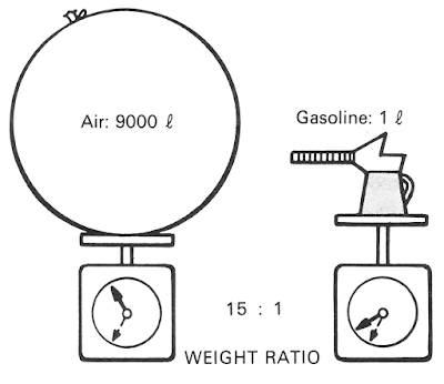 campuran udara–bahan bakar yang baik, uap bensin harus bercampur dengan sejumlah udara yang tepat. Perbandingan campuran udara–bahan bakar juga mempengaruhi pemakai bahan bakar. Perbandingan Udara–bahan bakar Perbandingan udara–bahan bakar dinyatakan dalam volume atau berat dari bagian udara–bahan bakar. Pada umumnya, perbandingan udara–bahan bakar dinyatakan berdasarkan perbandingan berat udara dengan berat bahan bakar. Bahan bakar harus dapat terbakar keseluruhannya di dalam ruang bakar untuk menghasilkan