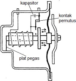 Bila kontak pemutus menutup, magnet listrik menarik jangkar dan membran, gerakan jangkar akan membuka kembali kontak-kontak pemutus, kemagnetan hilang, jangkar kembali pada posisi semula akibat dorongan pegas plat.Kondensator gunanya menghilangkan percikan api pada kontak pemutus. Baut penyetel berfungsi untuk menyetel kerenggangan kontak pemutus dengan jangkar
