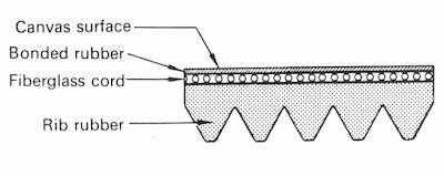 V-belt. V Ribbed belt mempunyai bentuk rusuk V-shaped rib pada bagian sisi pulley. Mereka mempunyai efesiensi pemindahan tenaga yang besar dan panas yang tinggi, tahan lama dibanding dengan V Belt serta berkurangnya bidang gesek sehingga mengurangi panas.