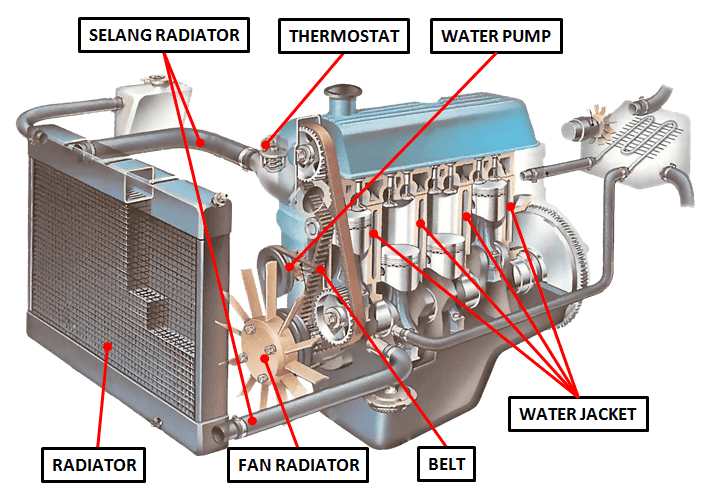 dilengkapi oleh water jacket pompa air, radiator, thermostat, kipas, selang karet dan lain-lain.