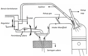 - Bensin dikabutkan secara terus menerus ke intake manifold dengan jumlah yang diatur oleh penimbang udara dan regulator