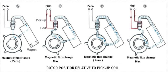 Saat gigi rotor berada pada posisi A , celah dengan pick up coil adalah yang terbesar sehingga gaya magnetnya pun sangat lemah dan tidak ada tegangan yang dibangkitkan. Pada posisi B perubahan garis gaya magnet adalah yang terbesar dan gaya gerak listrik yang dihasilkan maksimum. Pada posisi antara B dan C perubahan garis gaya magnet berkurang dan gaya listrik yang dihasilkan juga berkurang.Karena gaya gerak listrik dalam pick up coil diinduksikan dengan arah melawan perubahan garis gaya maka arah gaya listrik terbalik pada saat gigi signal rotor mendekati pick up coil seperti terlihat pada posisi B dan posisi D, dan pada posisi itulah tegangan yang dihasilkan tertinggi dengan arah yang berkebalikan.