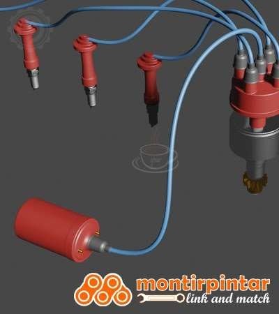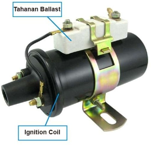 Prinsip kerja koil pengapian (ignition coil) pada sistem pengapian adalah menaikkan tegangan beterai 12 Volt menjadi tegangan pengapian sebesar 20.000 Volt – 30.000 Volt. Koil (coil) tersusun dari lilitan/gulungan kawat penghantar primer dan lilitan/gulungan kawat penghantar sekunder. Lilitan (coil) primer memiliki diameter kawat penghantar yang besar dan pendek, sedangkan lilitan sekunder memiliki diameter kawat penghantar yang kecil/ lembut dan panjang. Besar kecilnya tegangan listrik yang dapat diinduksikan oleh koil tergantung perbandingan antara lilitan primer dan lilitan sekunder ini. - Distributor (distributor)