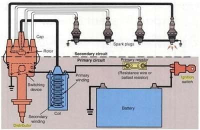 Sistem pengapian konvensional pada unit kendaraan ringan terdiri dari beberapa komponen yang satu sama lain dihubungkan membentuk suatu rangkaian. Komponen- komponen dari sistem pengapian konvensional diantaranya baterai (battery), kunci kontak (ignition switch), koil pengapian (ignition coil), distributor (distributor), kontak pemutus (breaker point), kondensator (condensator), kabel tegangan tinggi (high tension cord) dan busi (spark plug). Rangkaian dari komponen-komponen tersebut dapat diilustrasikan seperti gambar di bawah ini.